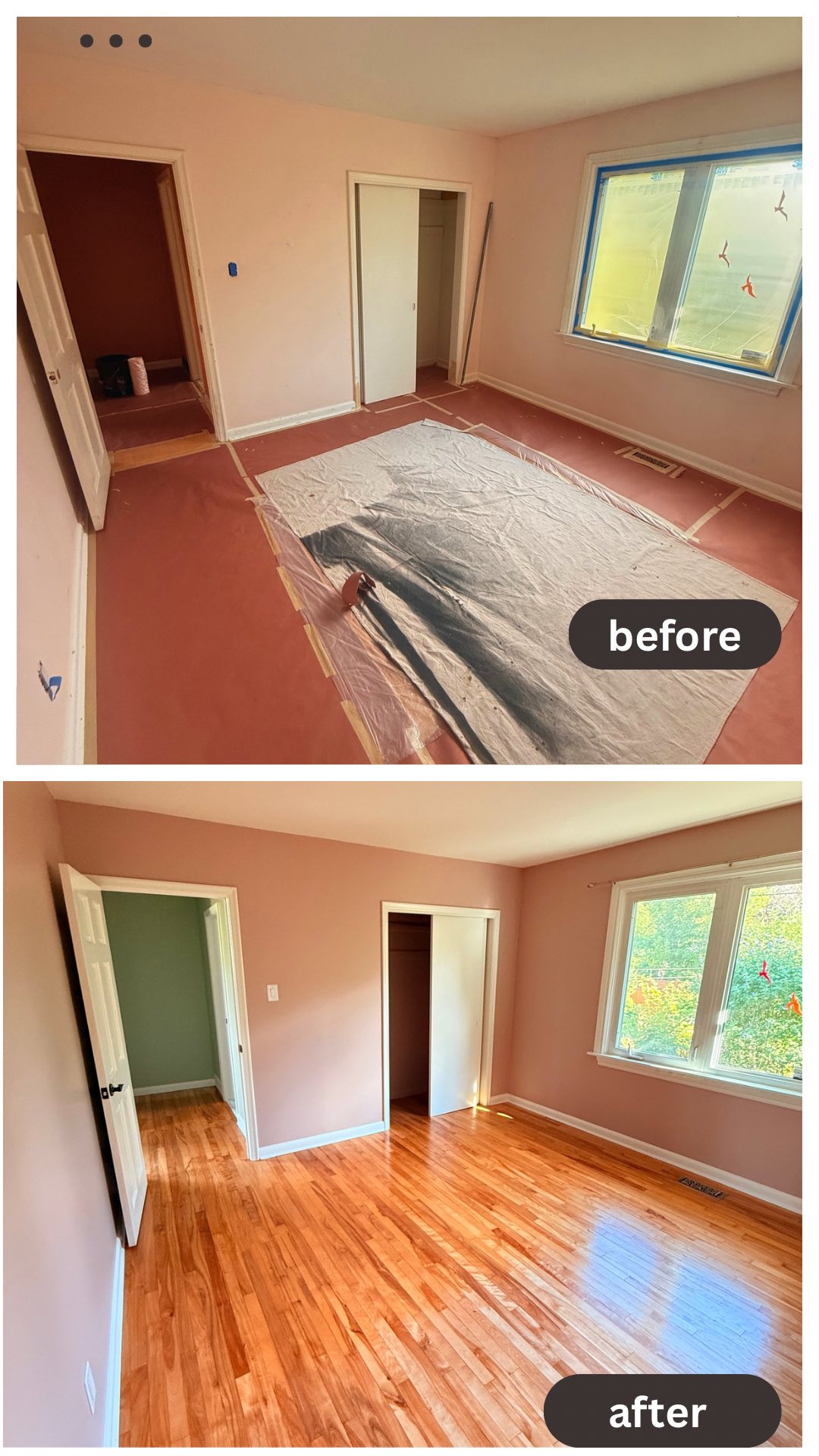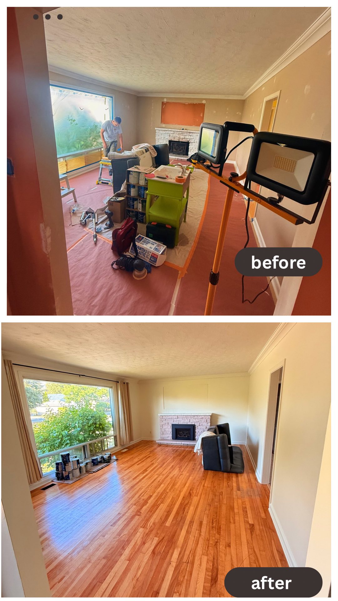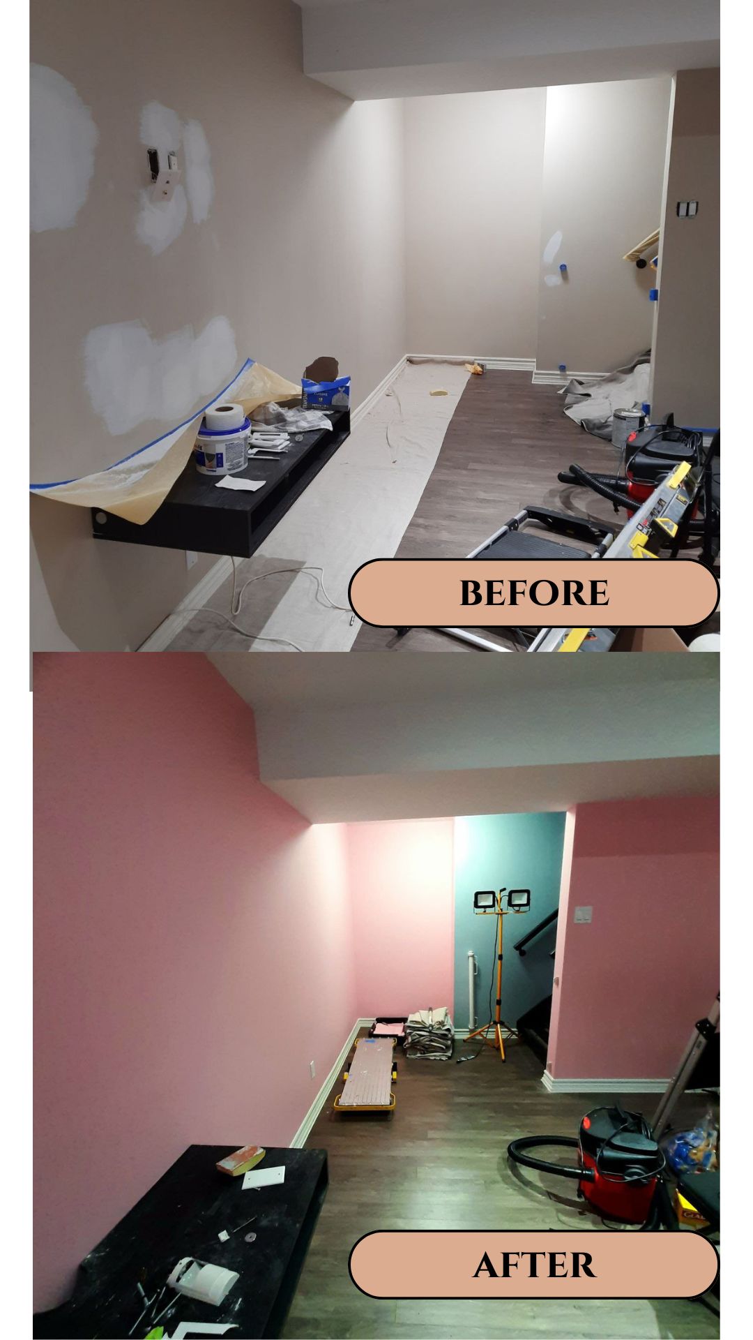 - 1. Room Preparation – We carefully move furniture to the center, cover it with clean plastic sheeting, and protect all flooring with drop cloths.